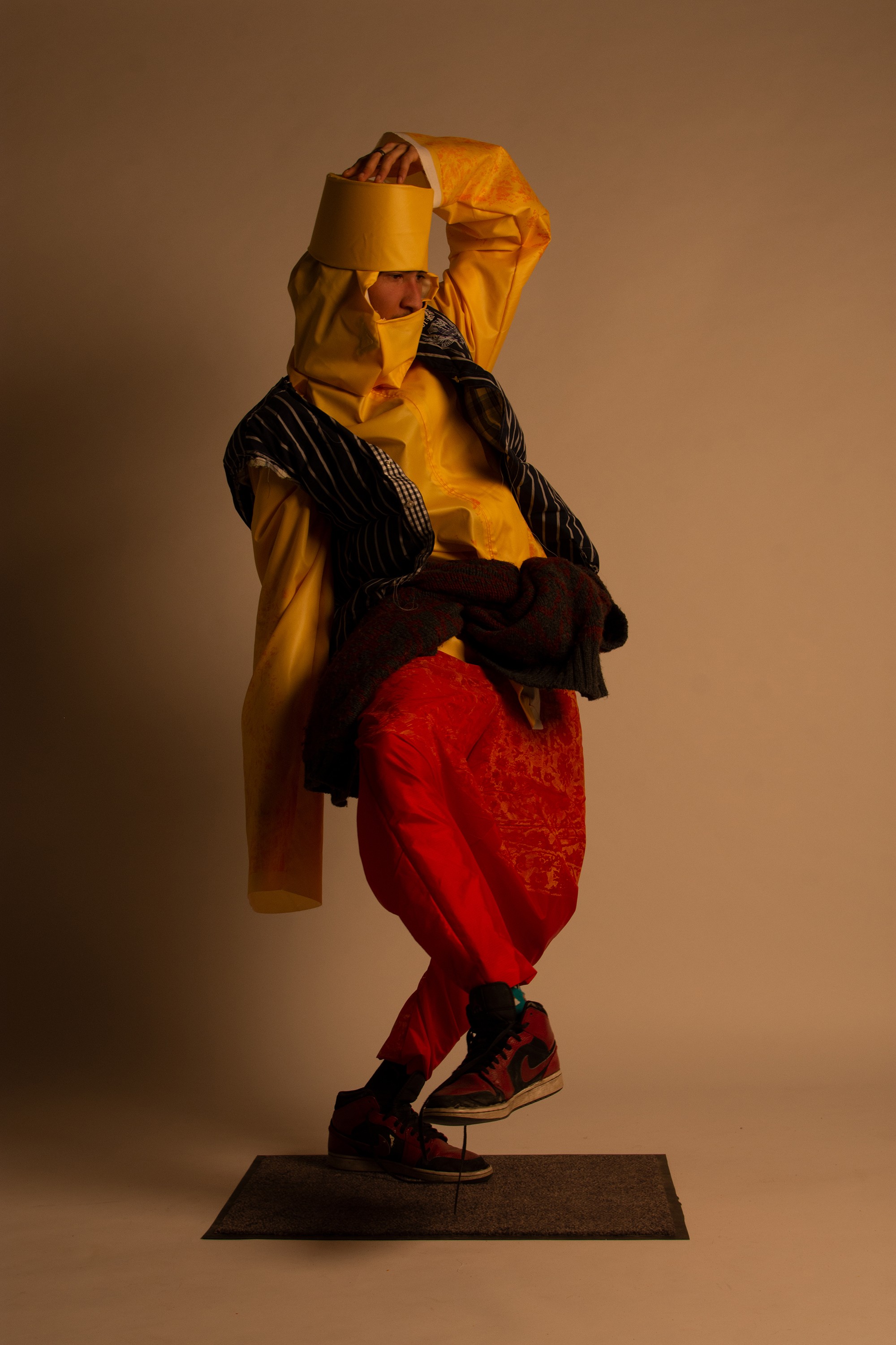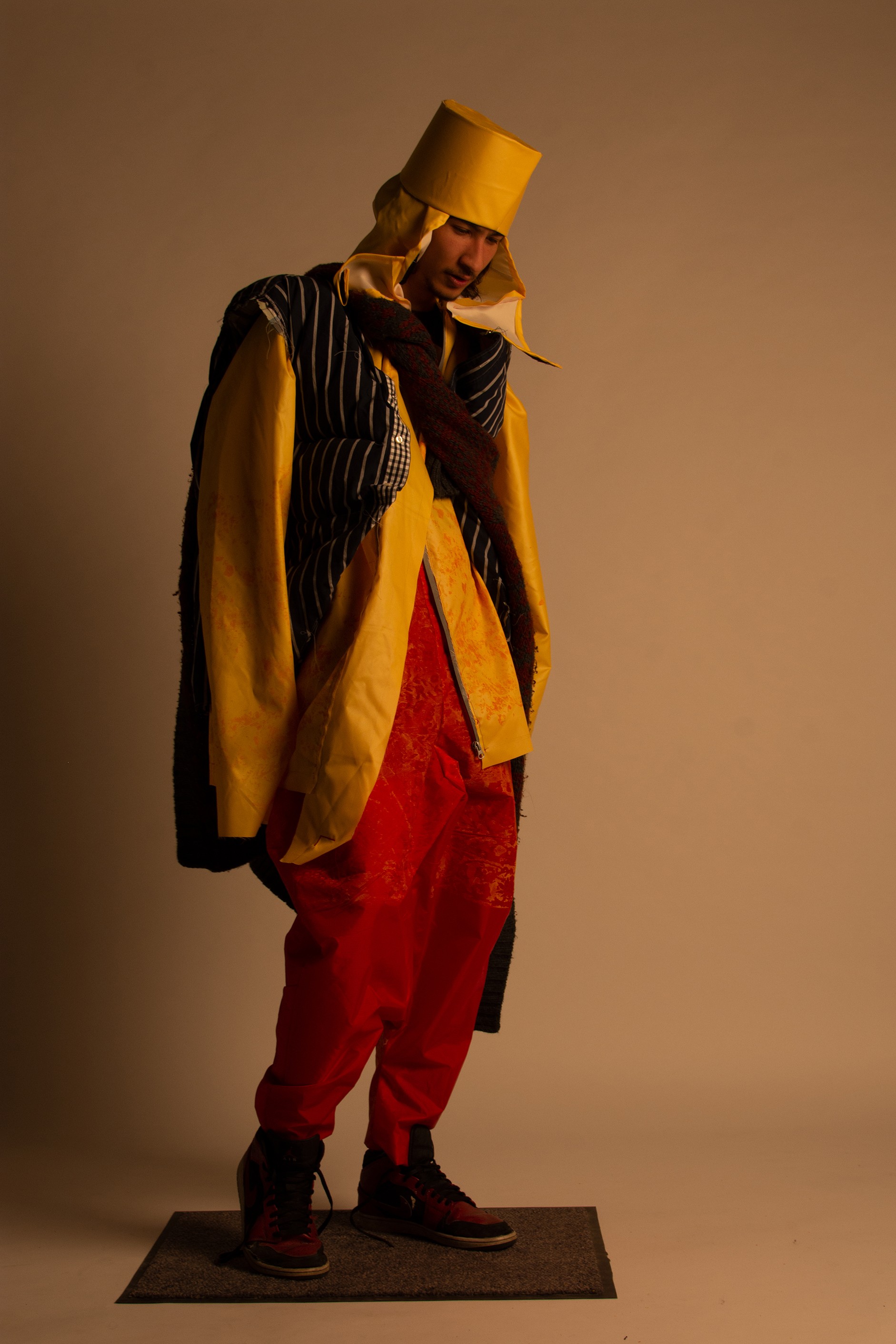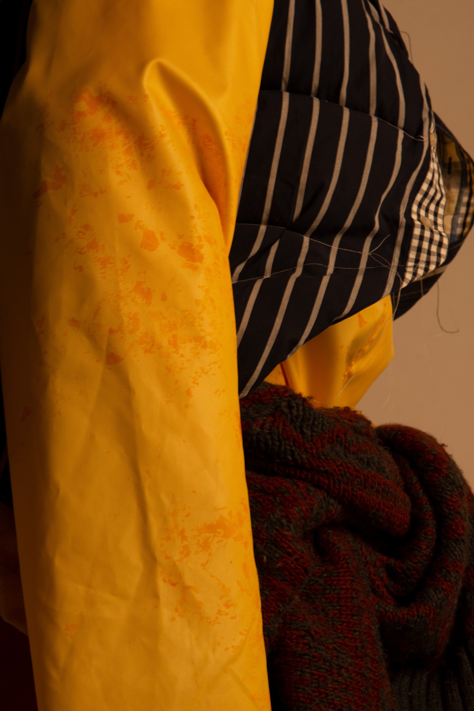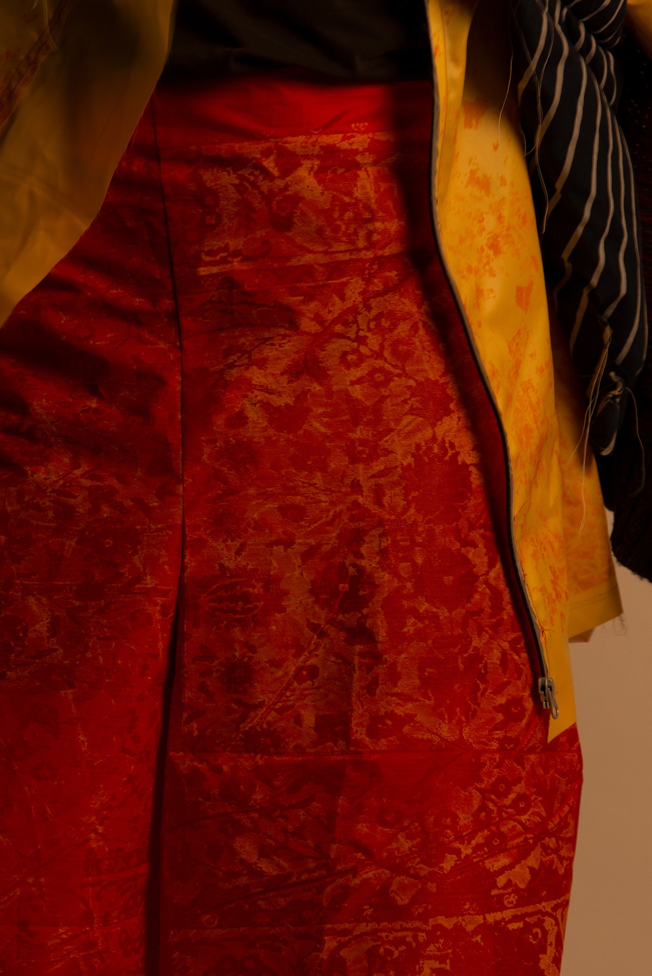 These are especially famous for their tulip designs. The more modern version of this craft would be hydrodipping. A series of abstract patterns were created with layering spray paint and spices. These were then scanned and vectorized to create a silkscreen. With the help of various spices, these being paprika, kurkuma, cumin and black pepper, a natrual textile dye was created thus bringing not only the look of the times but also the smell, creating a different dimension to the outfit.