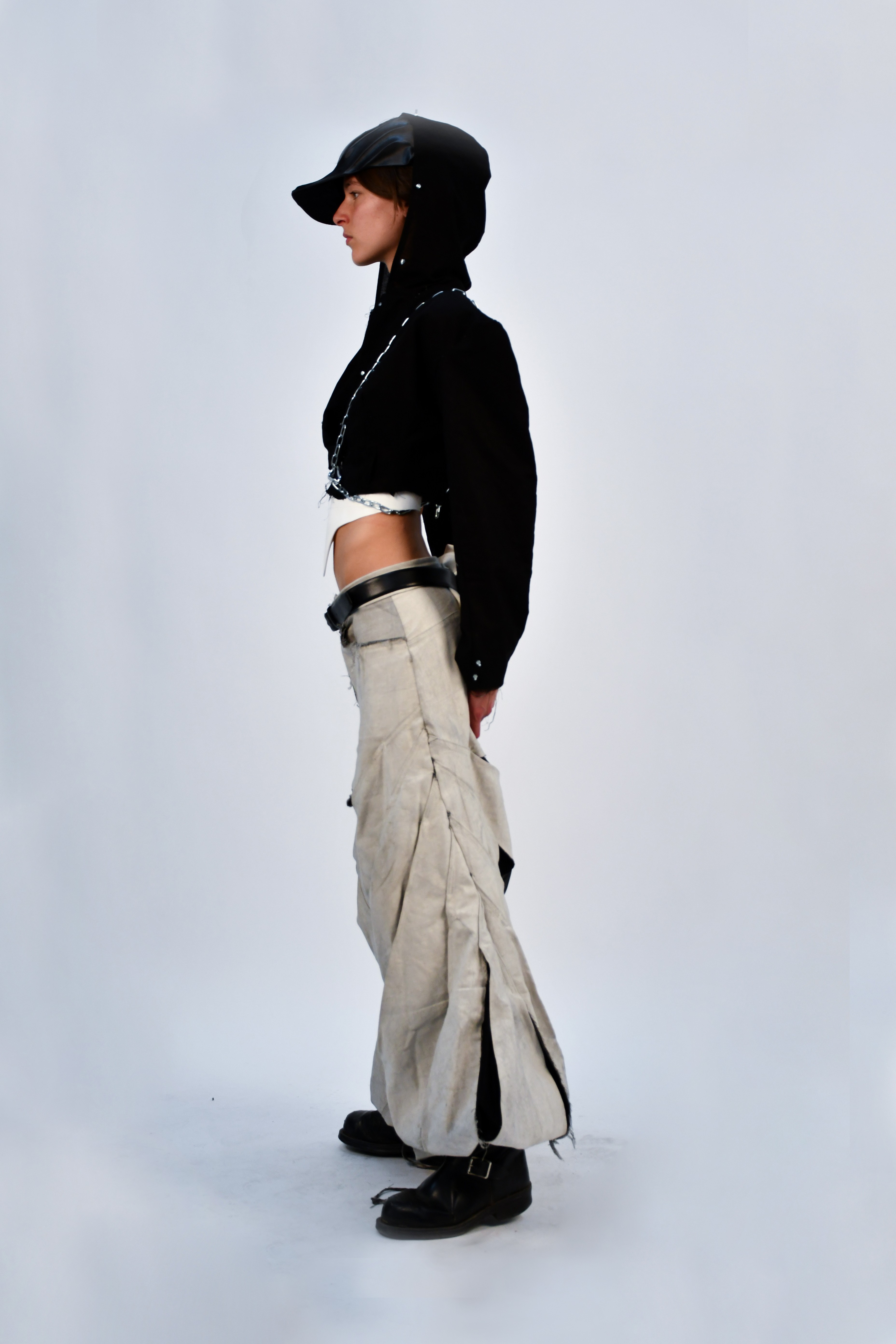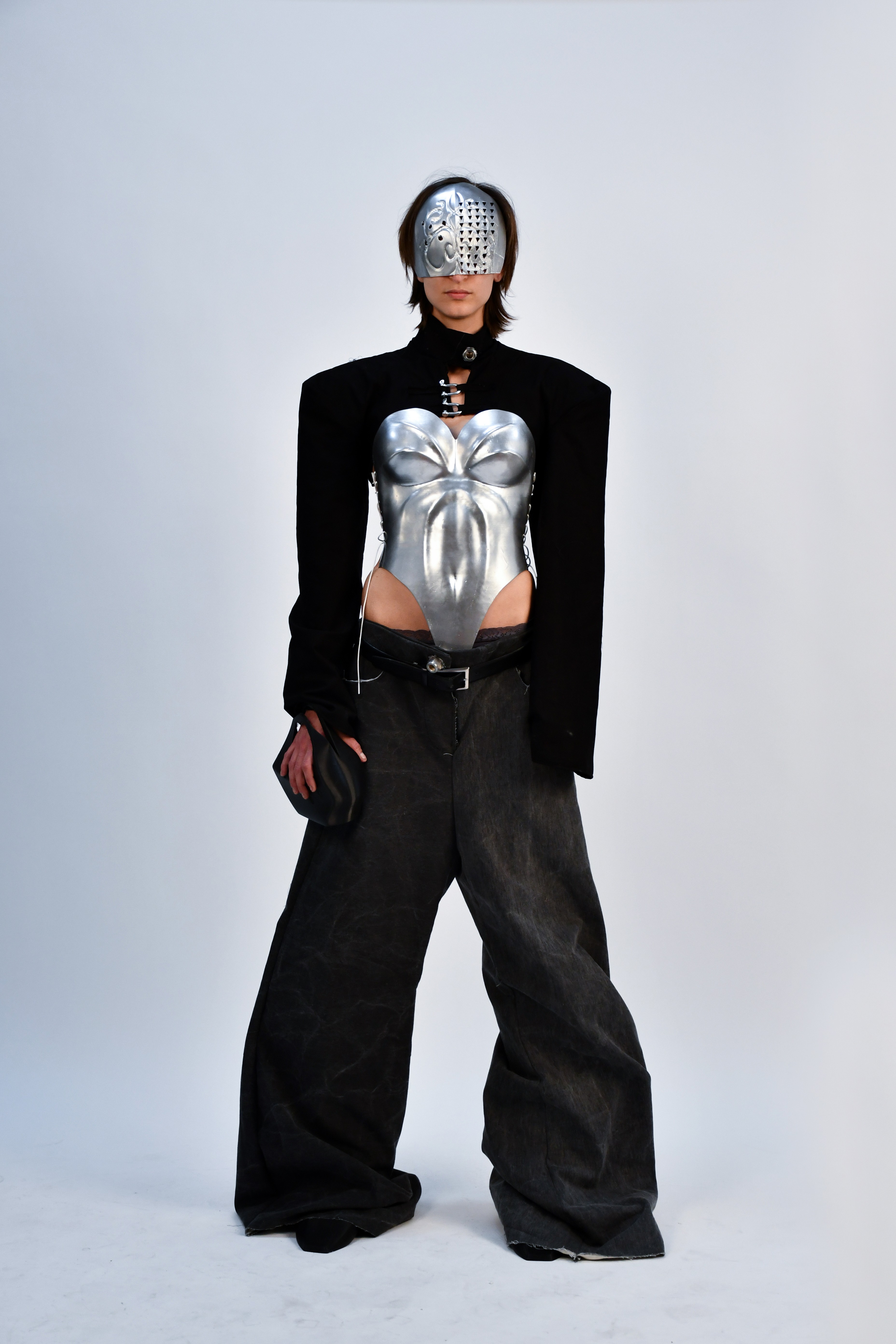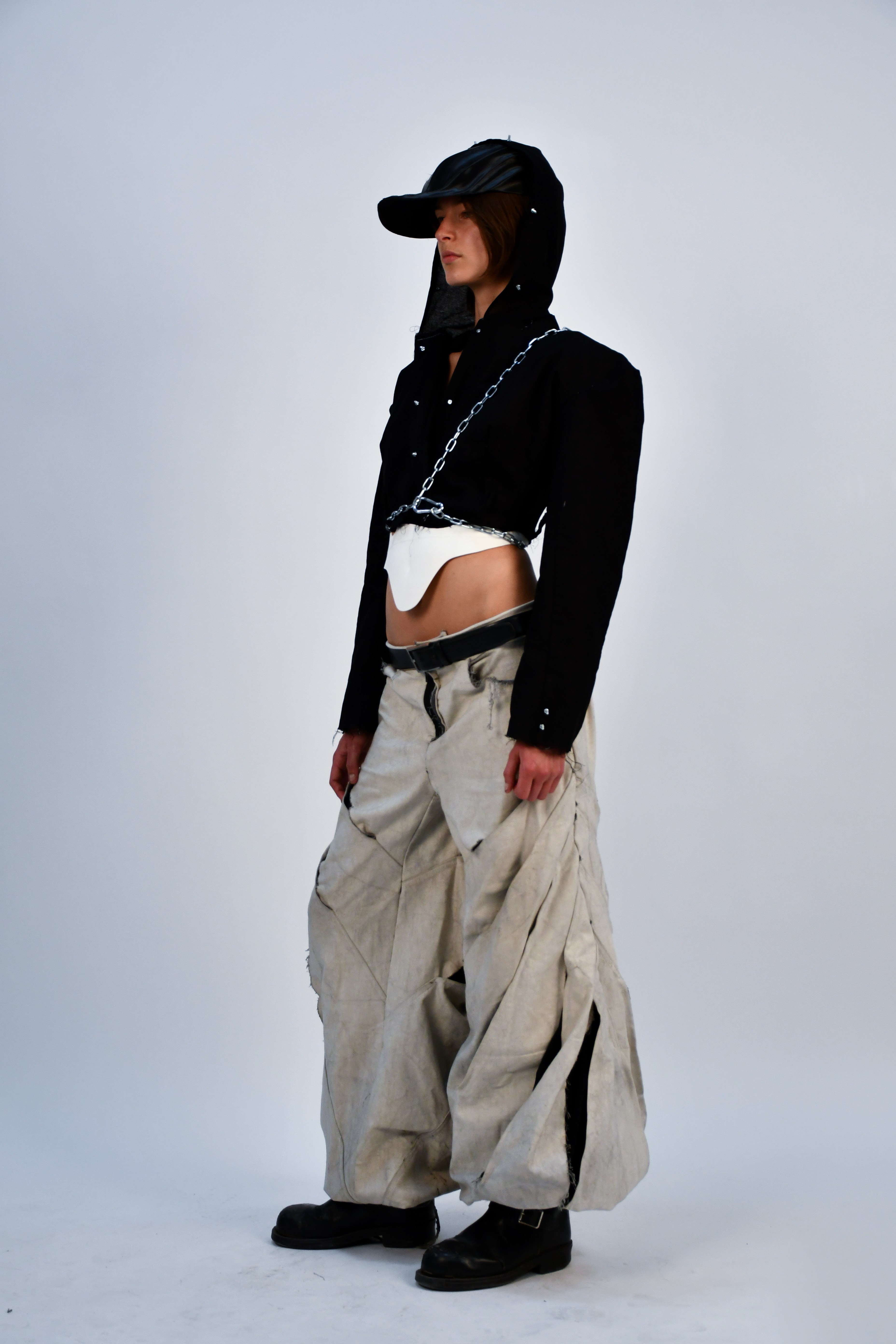 In a dystopian world where industrial laborers rise against systemic oppression, Factory Reclaimed reimagines clothing as a form of rebellion and self-expression. Drawing inspiration from factory floors, mechanical workshops, and the raw aesthetics of utility, this collection fuses fashion with hardware—incorporating nuts, bolts, carabiners, and industrial fasteners as integral design elements.