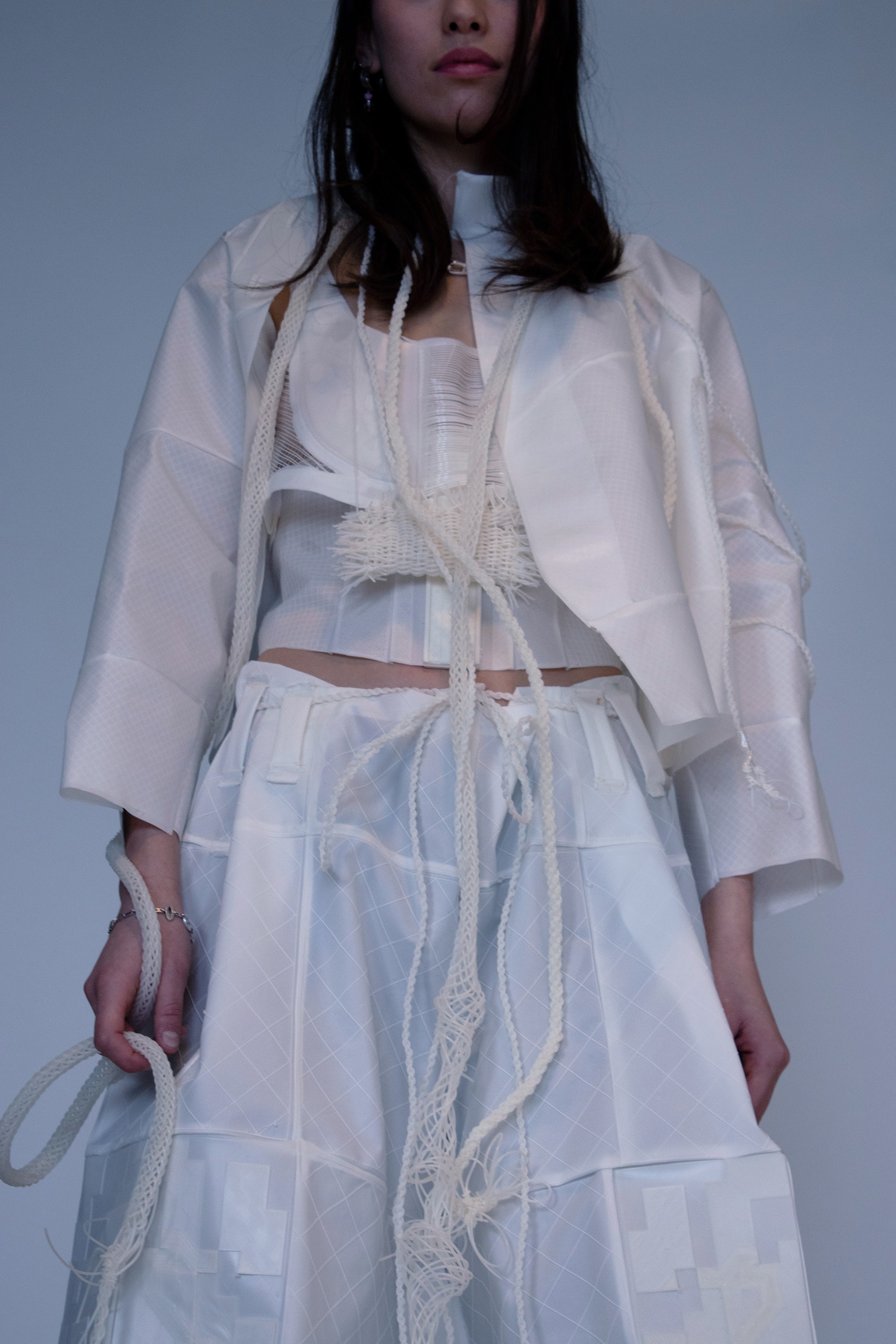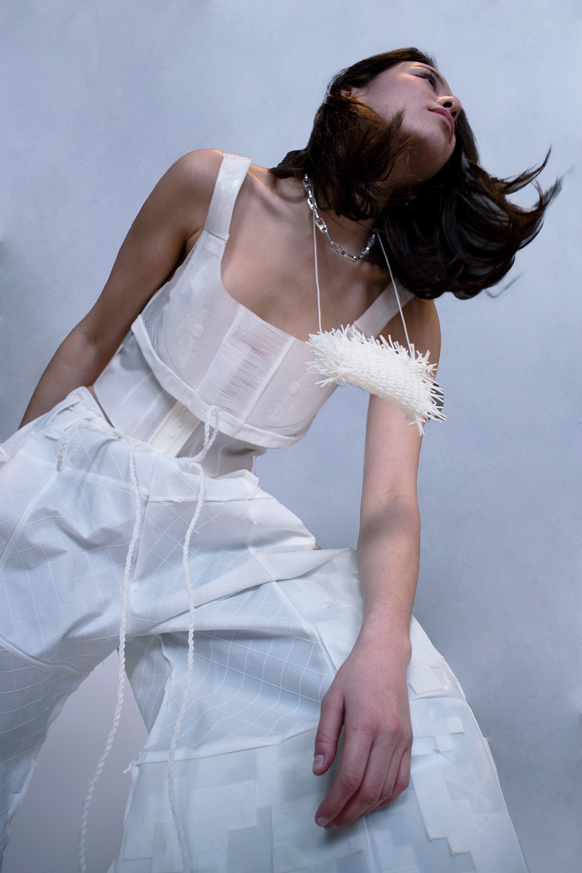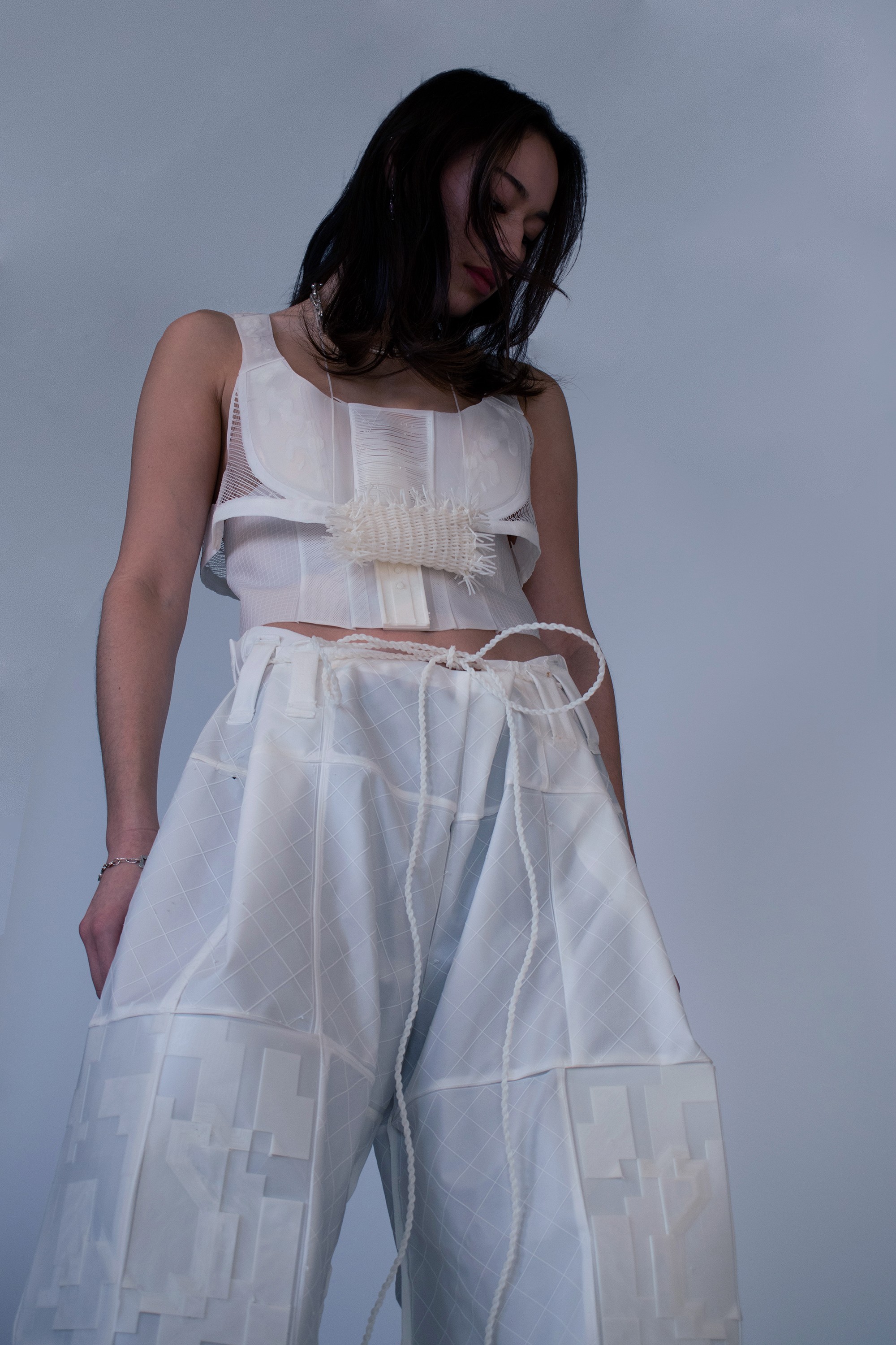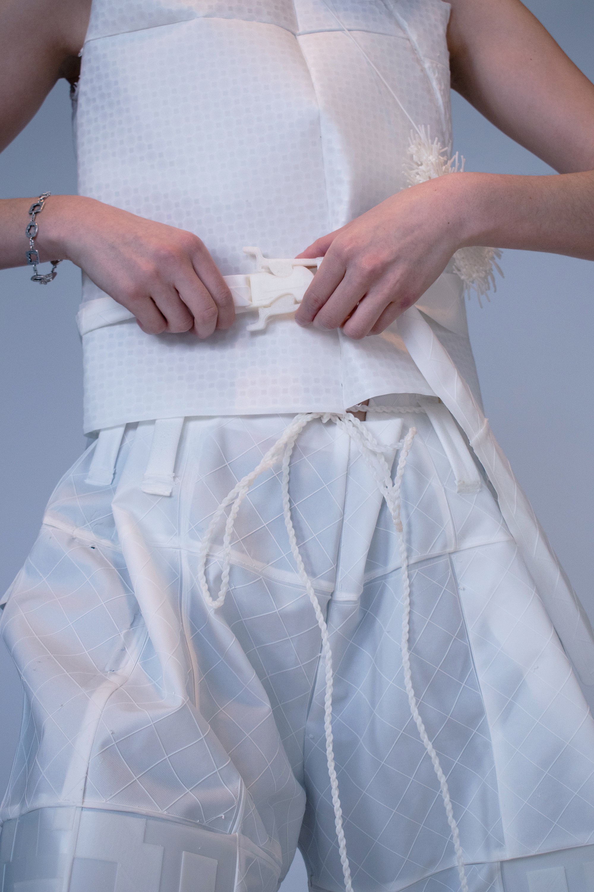 We seek to transform blendless mono-material into multi-functional pieces. Our goal is to use TPU (Thermoplastic polyurethane) to create systems in which materials are repeatedly re-used in a sustainable cy cle. With TPU, we are able to print thin, draping tis sue-like fabric and firm, so lid 3D forms. We can cre ate all of the parts of a garment from one material, making way for a whole new system
