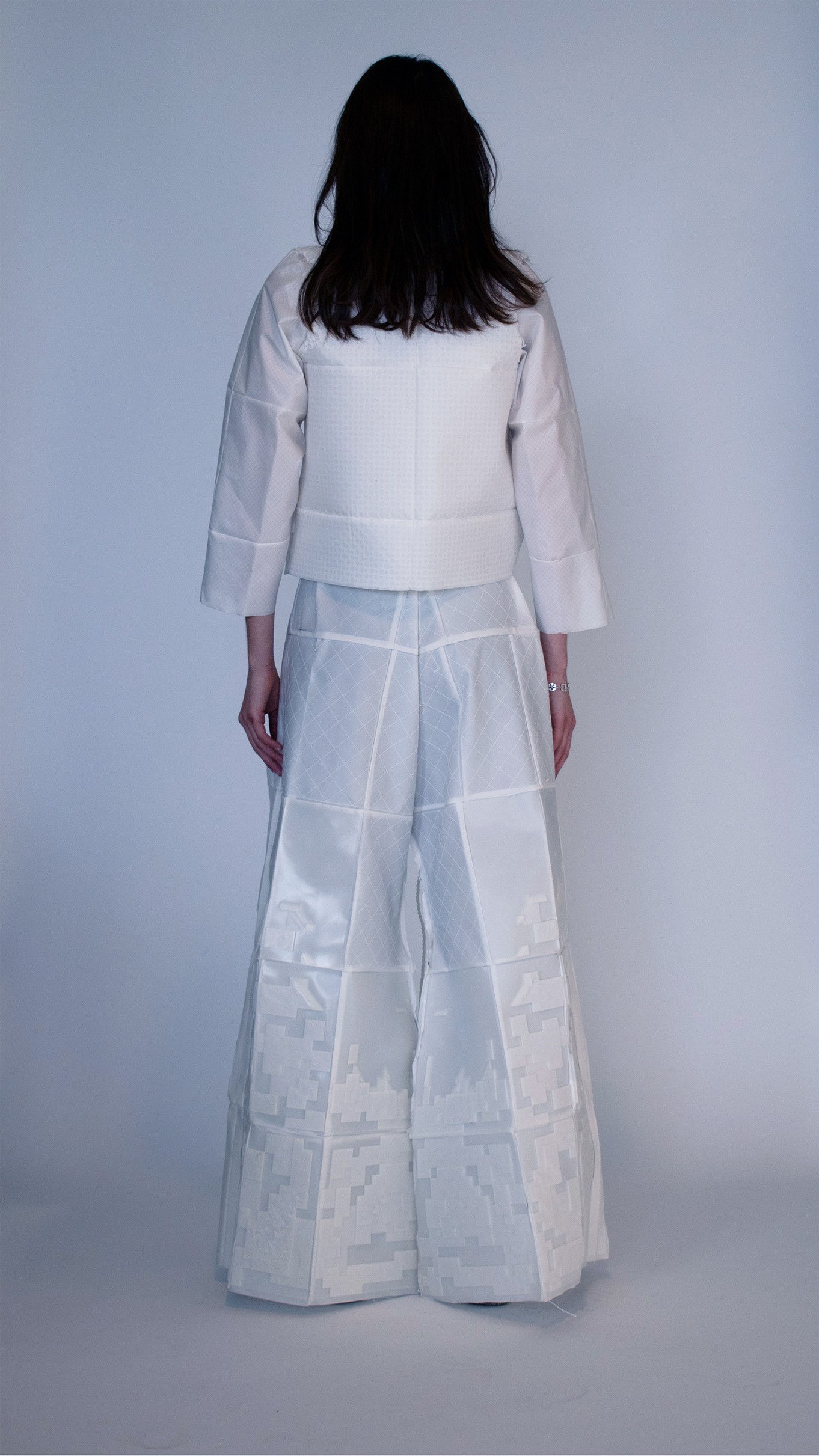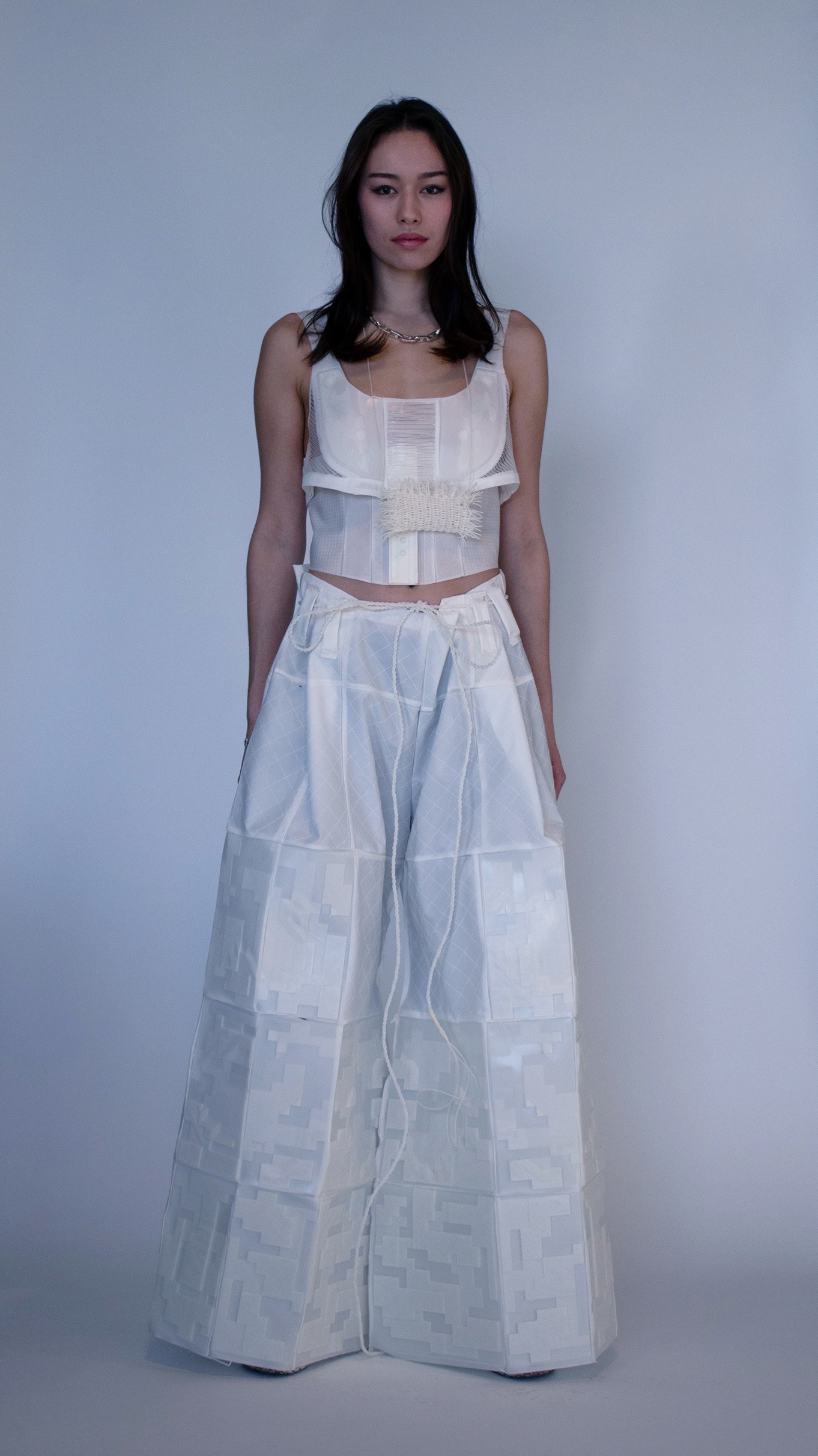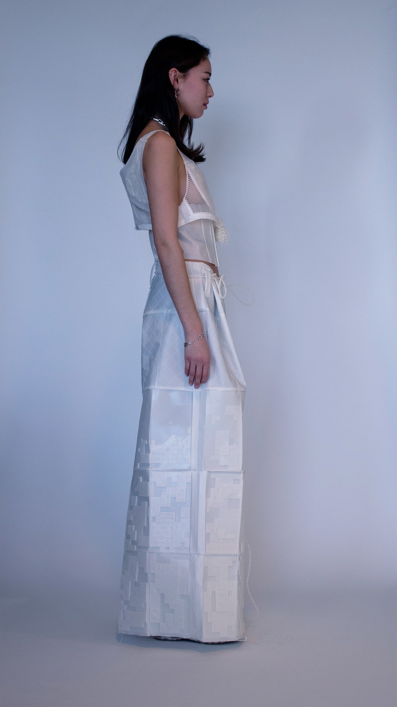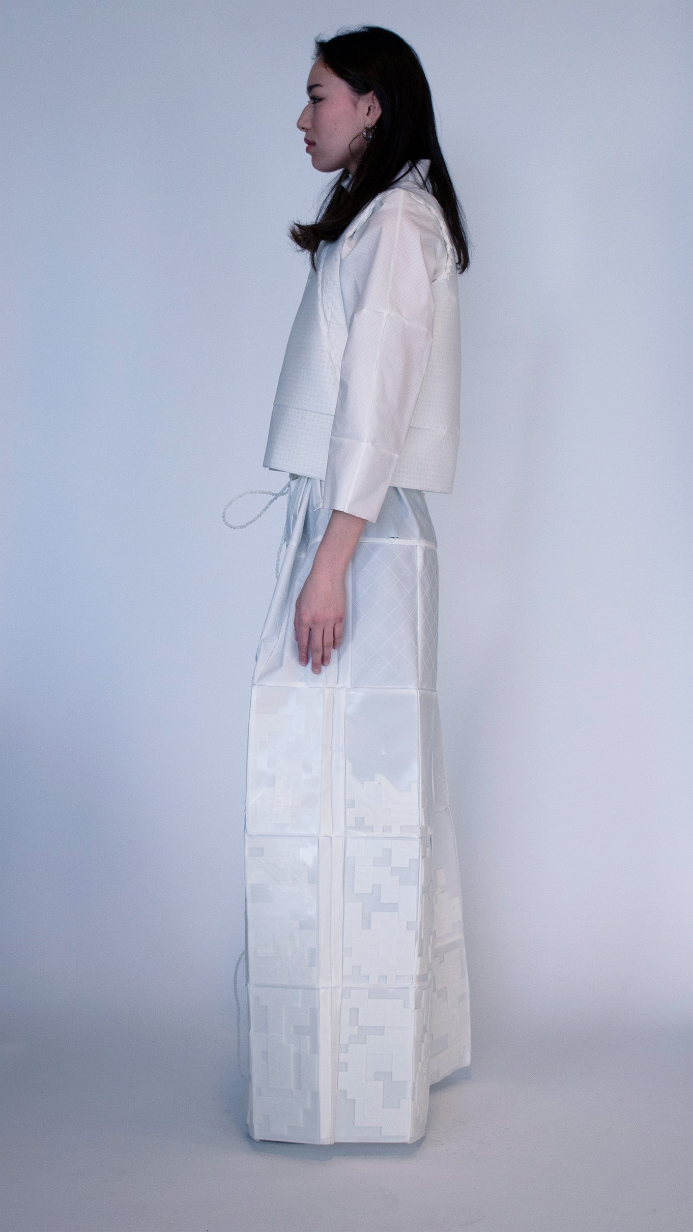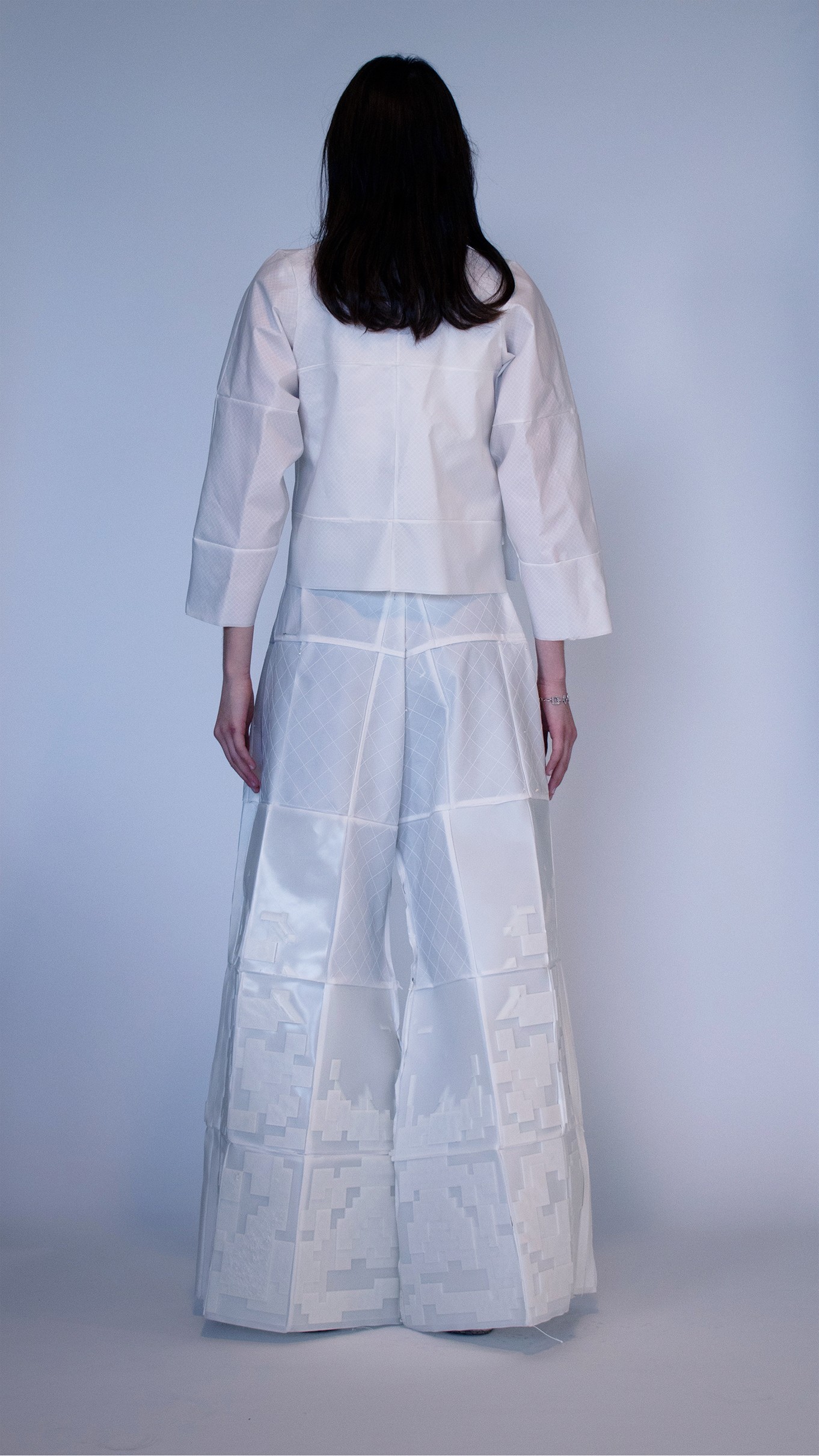 We seek to transform blendless mono-material into multi-functional pieces. Our goal is to use TPU (Thermoplastic polyurethane) to create systems in which materials are repeatedly re-used in a sustainable cy cle. With TPU, we are able to print thin, draping tis sue-like fabric and firm, so lid 3D forms. We can cre ate all of the parts of a garment from one material, making way for a whole new system