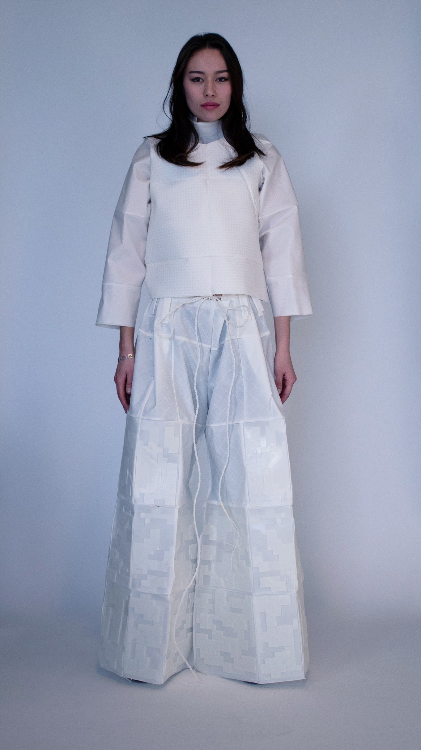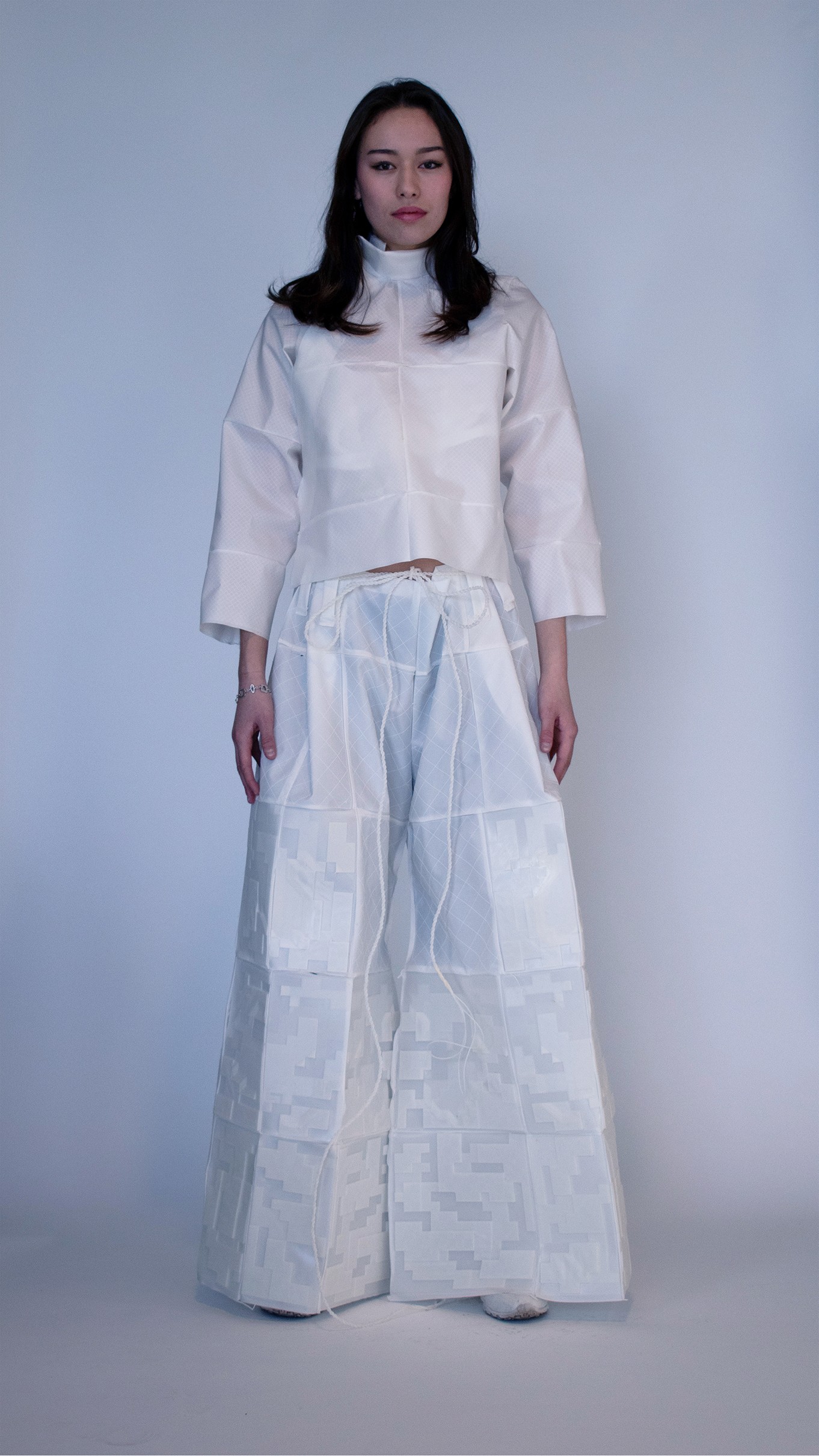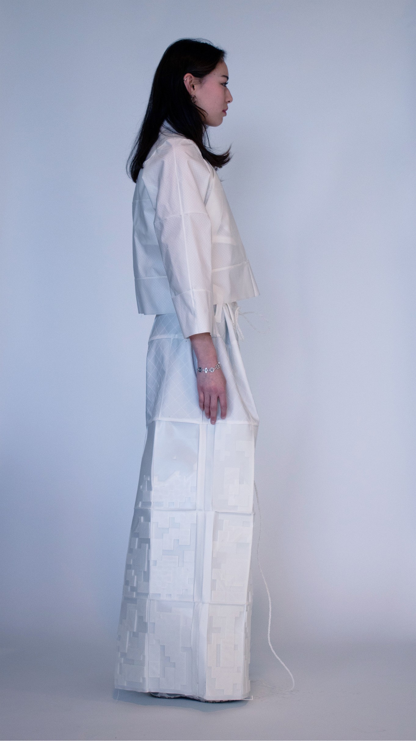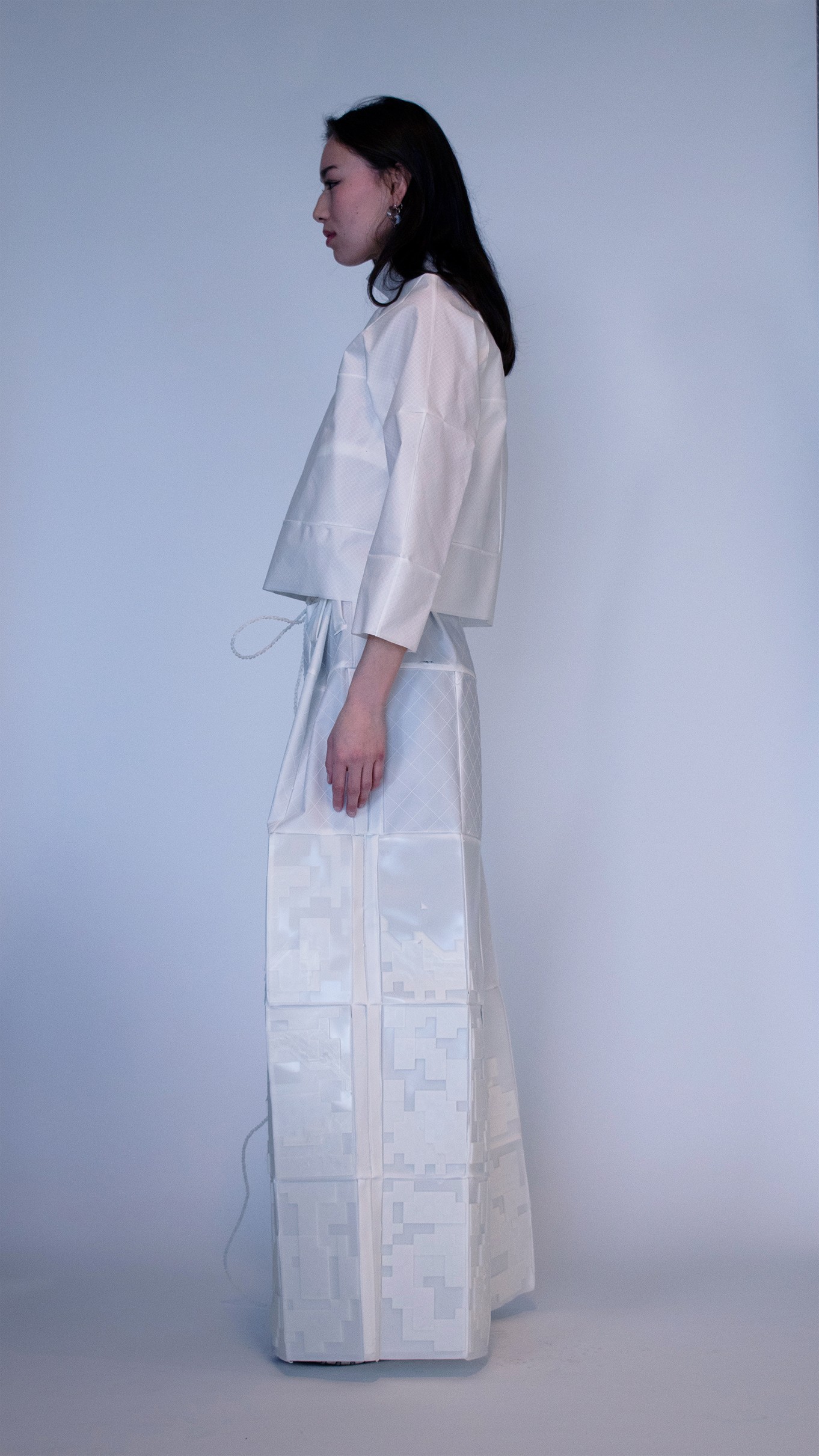 We seek to transform blendless mono-material into multi-functional pieces. Our goal is to use TPU (Thermoplastic polyurethane) to create systems in which materials are repeatedly re-used in a sustainable cy cle. With TPU, we are able to print thin, draping tis sue-like fabric and firm, so lid 3D forms. We can cre ate all of the parts of a garment from one material, making way for a whole new system