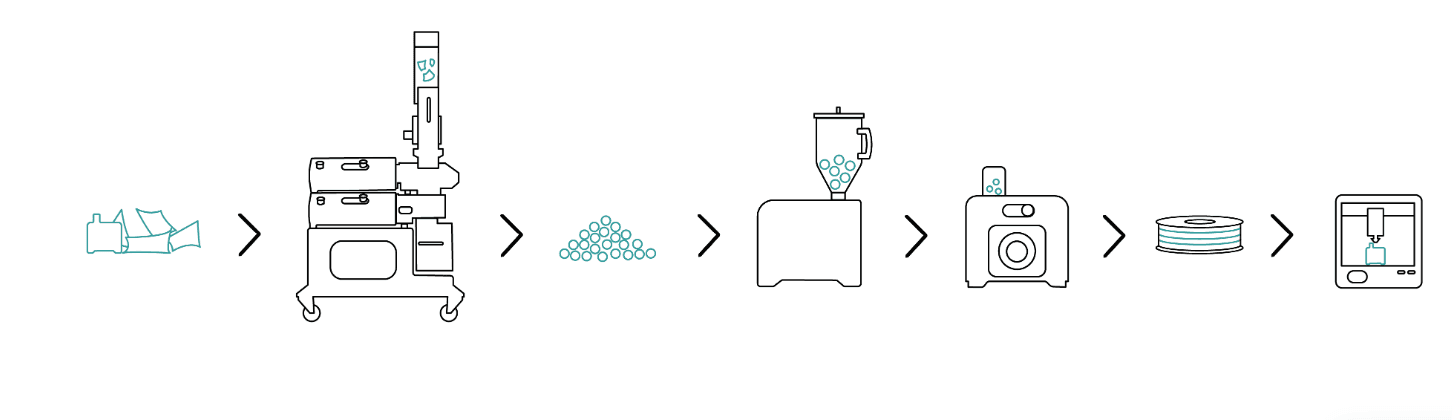 Our vision is circular: TPU filament is printed Garment is assembled (melted together) Garment is worn Garment is re-melted Extruded back into filament form Garment is re-created into a new seasonal piece